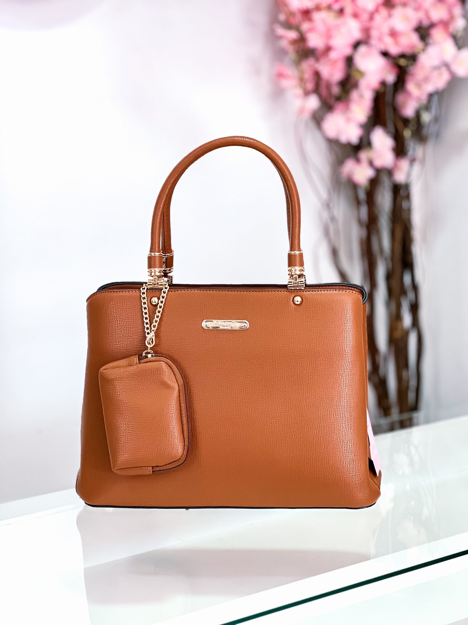 - Alça: ajustável e removível com detalhes metálicos dourados