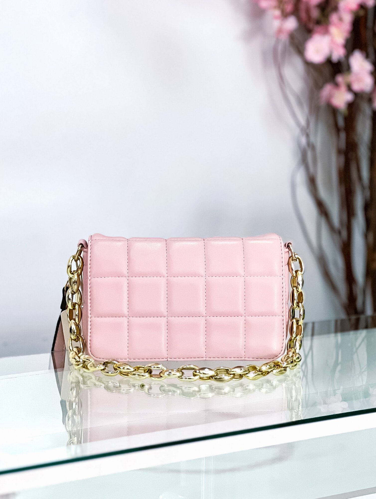 - Alça: ajustável e removível com detalhes metálicos dourados