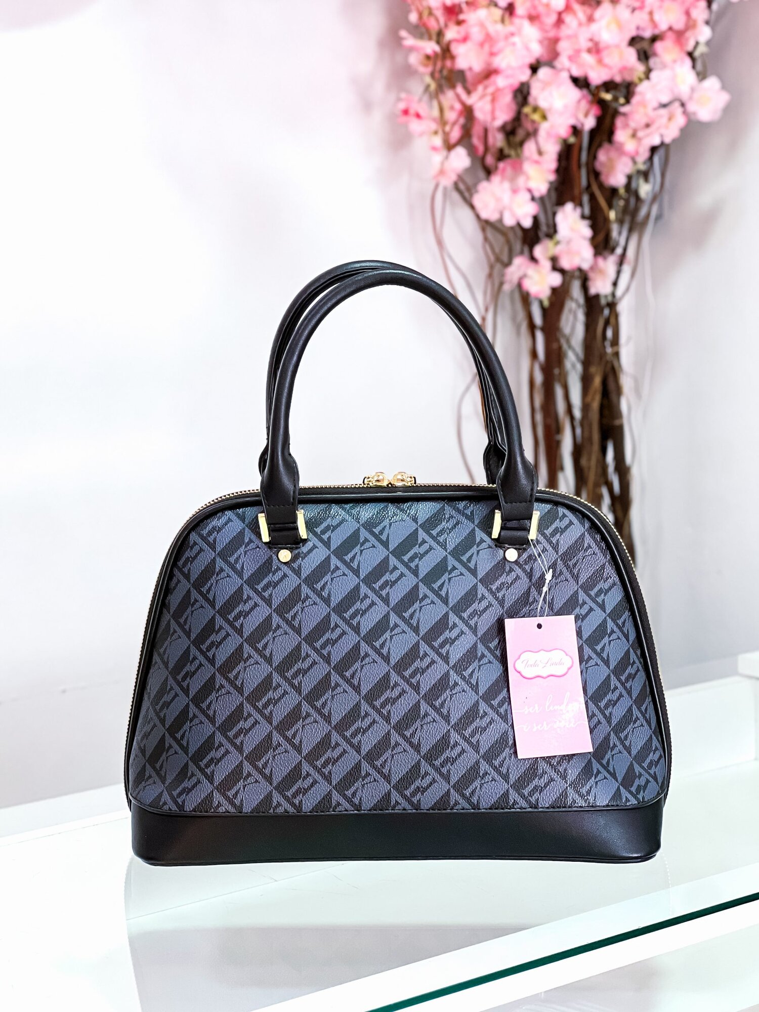 - Alça: ajustável e removível com detalhes metálicos dourados